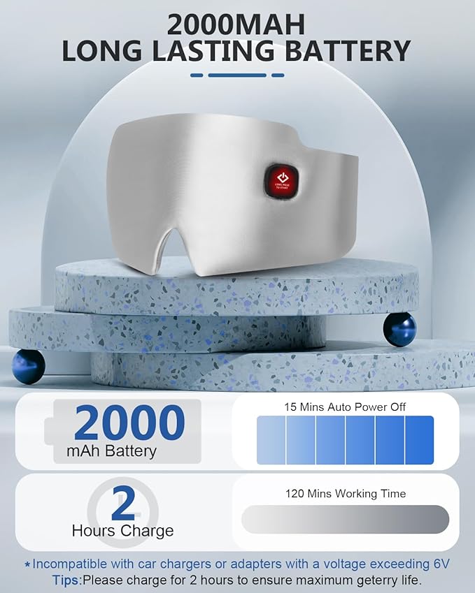 - Power-Packed 2000mAh Battery for Extended Bliss: Boasting a high-capacity 2000mAh battery, our eye mask outshines the competition. It charges fully in just 2 hours and provides an impressive 8 uses at high temperature and 10 uses at low temperature. This extended battery life means you can enjoy uninterrupted relaxation sessions without the worry of frequent recharging, whether you're at home, traveling, or taking a break at work.