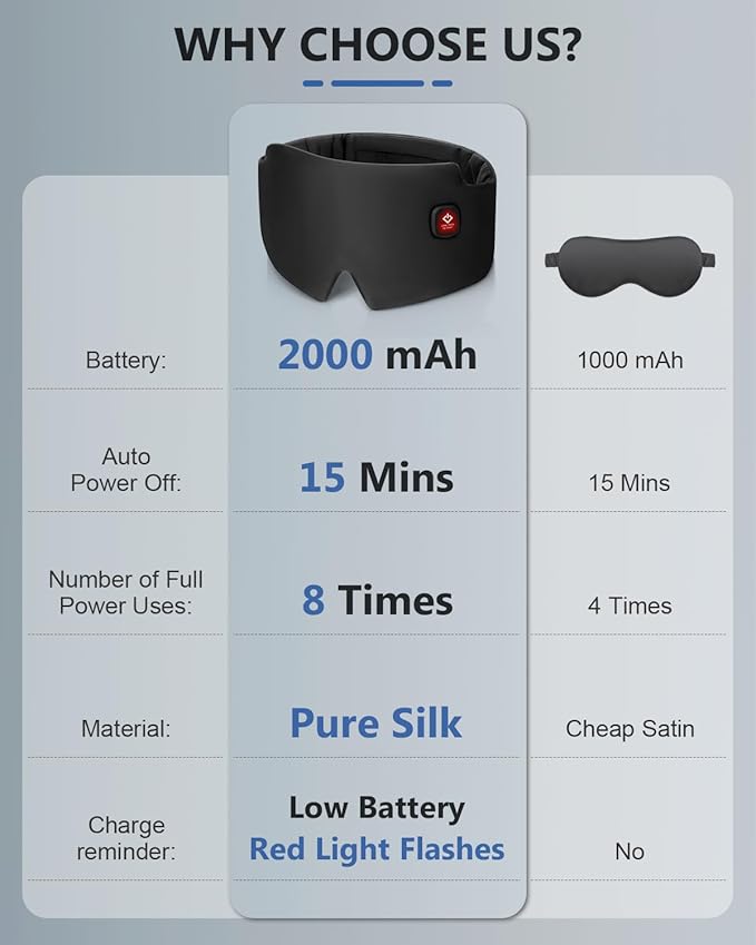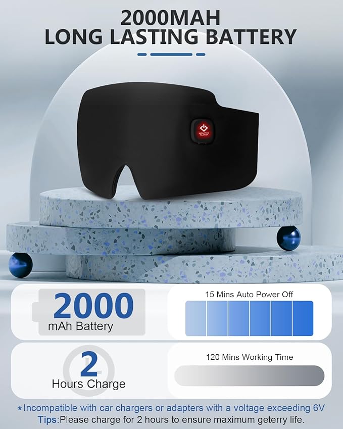 - Power-Packed 2000mAh Battery for Extended Bliss: Boasting a high-capacity 2000mAh battery, our eye mask outshines the competition. It charges fully in just 2 hours and provides an impressive 8 uses at high temperature and 10 uses at low temperature. This extended battery life means you can enjoy uninterrupted relaxation sessions without the worry of frequent recharging, whether you're at home, traveling, or taking a break at work.