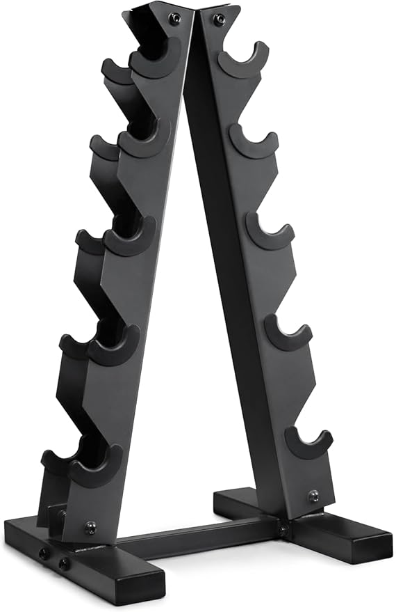 - SPACE-SAVING DESIGN – The A-frame design of this rack maximizes floor space by storing dumbbells in an “A” shape, or vertical fashion. Easily access and store dumbbells. Rubber inserts prevent dumbbells and rack from scratches