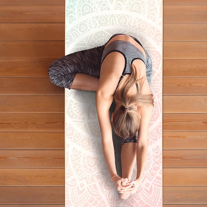 Colorful Star Large Yoga Towel with Corner Pockets, Non Slip Grip Dots Sweat Absorbent Hot Yoga Mat Towels, Yoga Blankets with Travel Bag, Mat Cover for Workout, Gym, Fitness - 74"x26", Pink Mandala