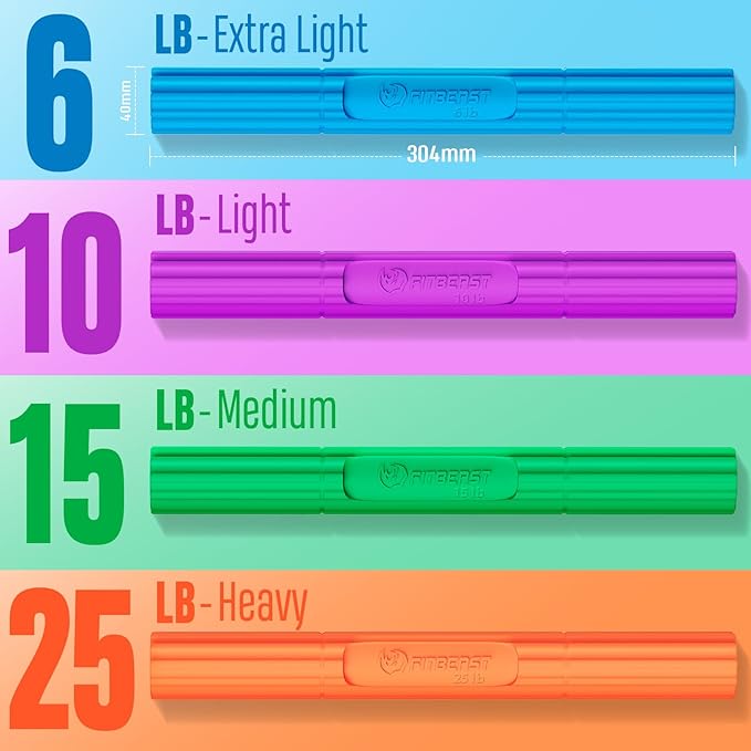 - ๐ฐ-๐๐ฒ๐๐ฒ๐น ๐ฅ๐ฒ๐๐ถ๐๐๐ฎ๐ป๐ฐ๐ฒ ๐ฆ๐ฒ๐ ๐ณ๐ผ๐ฟ ๐ฃ๐ฟ๐ผ๐ด๐ฟ๐ฒ๐๐๐ถ๐๐ฒ ๐ง๐ฟ๐ฎ๐ถ๐ป๐ถ๐ป๐ด: Elevate your workout with the wrist exerciser bars set, featuring four color-coded resistance levels, ranging from 6 to 25 lbs. Tailor your exercise routine with: Blue (6LB, Extra Light), Purple (10LB, Light), Green (15LB, Medium), and Orange (25LB, Heavy), allowing for a progressive increase in strength. Ideal for physical therapy and arm muscle development, start with the level that suits you and advance at your own pace.