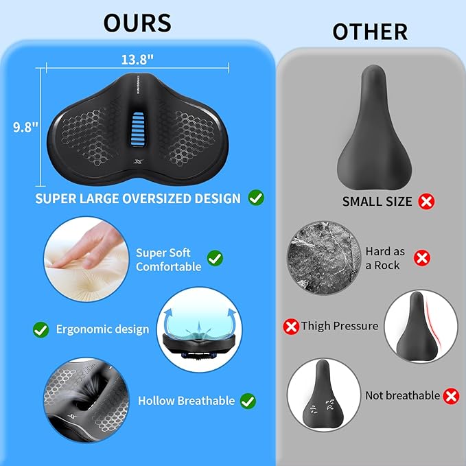 - Ergonomic Design for Bike Accessories: Bike seat oversized offers a larger, more supportive seating area combined with a vented middle section for superior breathability. Designed with ergonomics, this comfortable bike seat reduces pressure points for a smoother ride on peloton bike, exercise bike, mountain bikes, cruiser bike, stationary bike, mountain bikes.