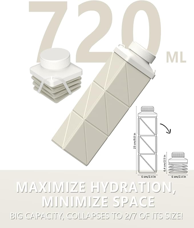 - COLLAPSIBLE, COMPACT WATER BOTTLE DESIGN: Expands to 24.3oz/720ml and folds down to about 2/7 of its size, saving valuable space in your bag or backpack—perfect for on-the-go hydration without the bulk.