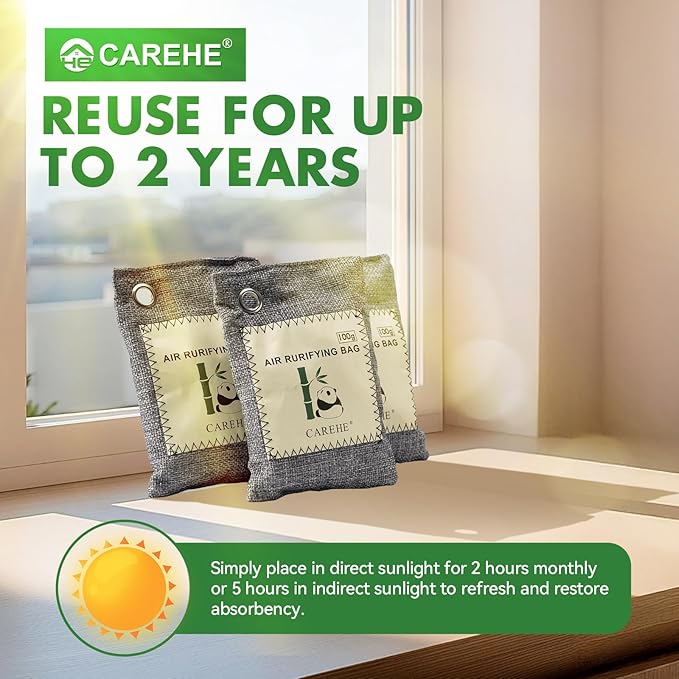 - Rechargeable - Each charcoal bag can be reused for up to 2 years, simply by placing it in direct sunlight for a few hours each month to rejuvenate its absorbing capacity.