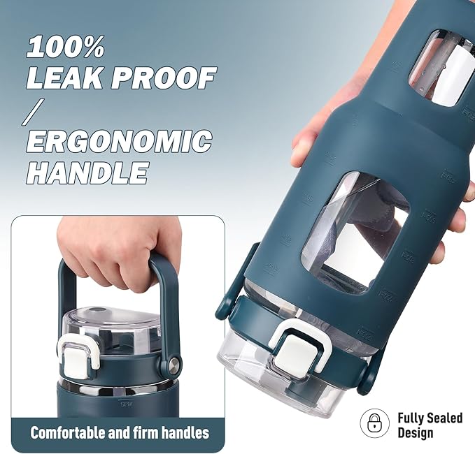 - Lockable & Leakproof Flip Lid: The handy, lockable flip lid prevents leaks and can be opened with one hand for those times when you’re on the move and your arms are full. Our leak-proof glass water bottle with straw makes your drinking dribble-free. The straw spout gives you a comfortable and quick drinking experience and this glass water bottles with time marker comes with 2 straws and the carrying handle on top makes it easy to tote around town.