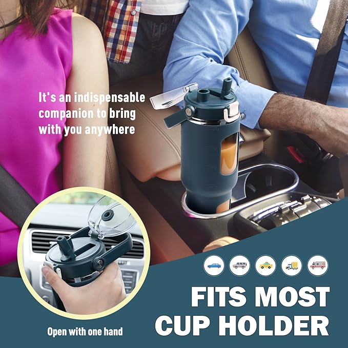 - Straw Spout: Our glass water bottle comes in different color options and 4 sizes(32-ounce, 40-ounce, 56-ounce and 64-ounce) to fit most tastes and needs. Whenever you want to take a swig of water, you can unlock the cap and chug away out of the spout. When it’s time to refill your bottle with water and ice, you can take the whole lid off, revealing the ultra wide mouth. This glass tumbler fits in most car cup holders.