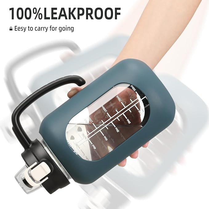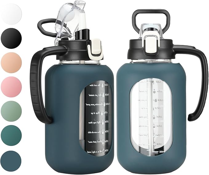 64 oz Glass Water Bottle with Straw and Handle Half Gallon Water Jug with Silicone Sleeve Large Water Bottle for Office, Gym, Outdoor Sports