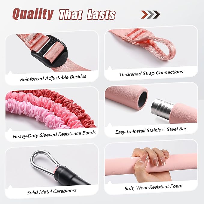 - 【Ultra-Durable Resistance Band Safety System】The ALongSong pilates set upgraded to 6 premium thickened natural latex tube resistance bands (20/30/40 lbs each) with outer layer reinforced with braided fabric for enhanced tear resistance and safety. Triple-layer protection ensures maximum durability during intense stretching, strength training or dynamic Pilates movements.
