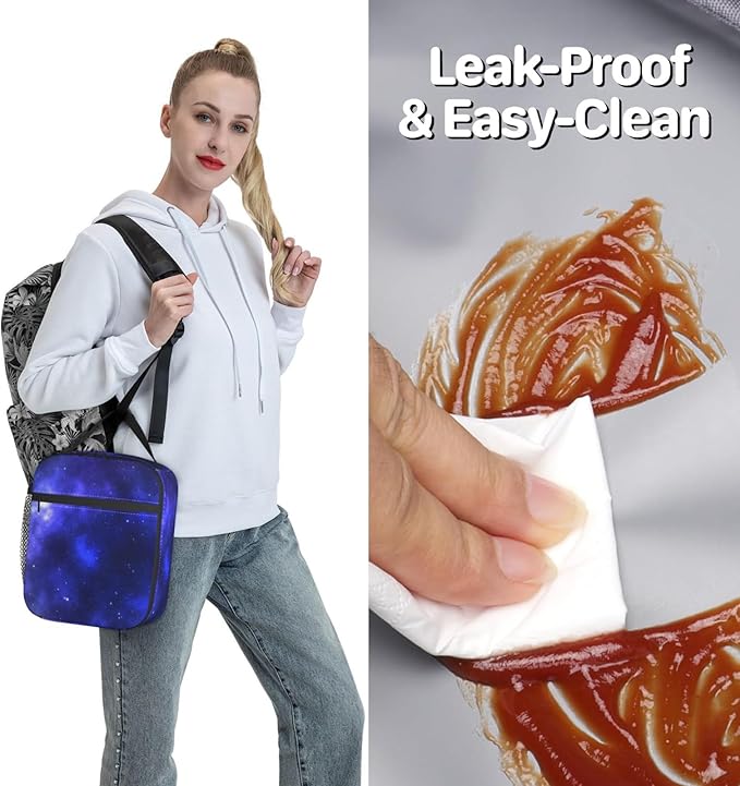 - 【Spacious & Functional Design】The lunch bag comes with a main compartment that includes a zippered mesh pocket inside for utensils, napkins, or snacks. The front zippered pocket is perfect for storing small items like keys, phone, or condiments. Additionally, a side mesh pocket (on the left when facing the bag) provides easy access to your water bottle or thermos, keeping you organized on the go.