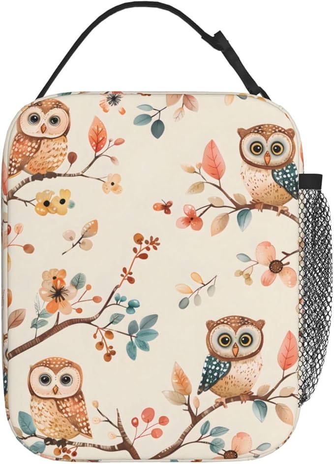 Cool Owl Lunch Box for Kids,Bird Insulated Bag for Student,Animal Reusable Thermal Insulation Cooler Tote Bags for School Work Picnic Camping Outdoor Gifts (Woodland Owl and Floral)