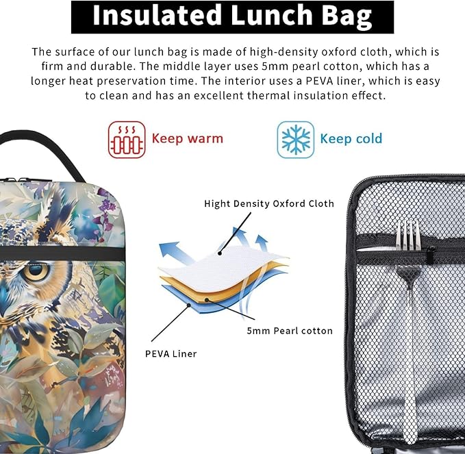 Cute Owl Lunch Box for Women Adults Kids, Insulated Cooler Lunch Bag for Picnic, School, Office, Travel, Work, Portable Reusable Polyester Tote Thermal Lunch Bags (Elegant Owl)