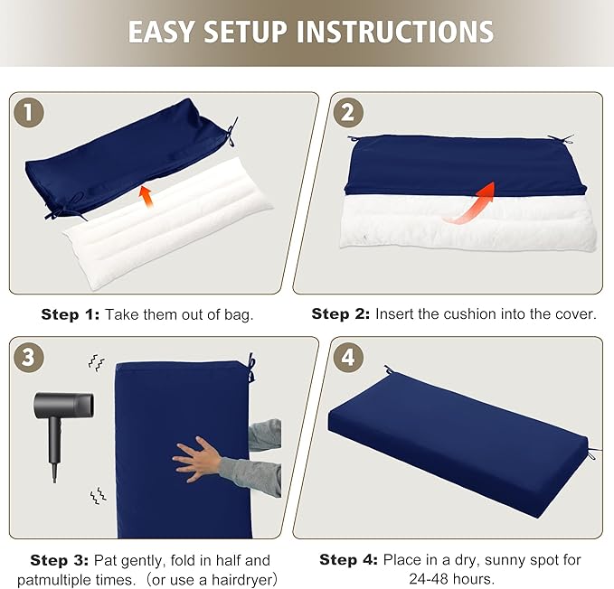 Outdoor Bench Cushion Waterproof 45"x18" – Fade-Resistant Patio Furniture Cushion with Ties for Porch Swing, Loveseat, or Indoor Bench Replacement, Navy Blue
