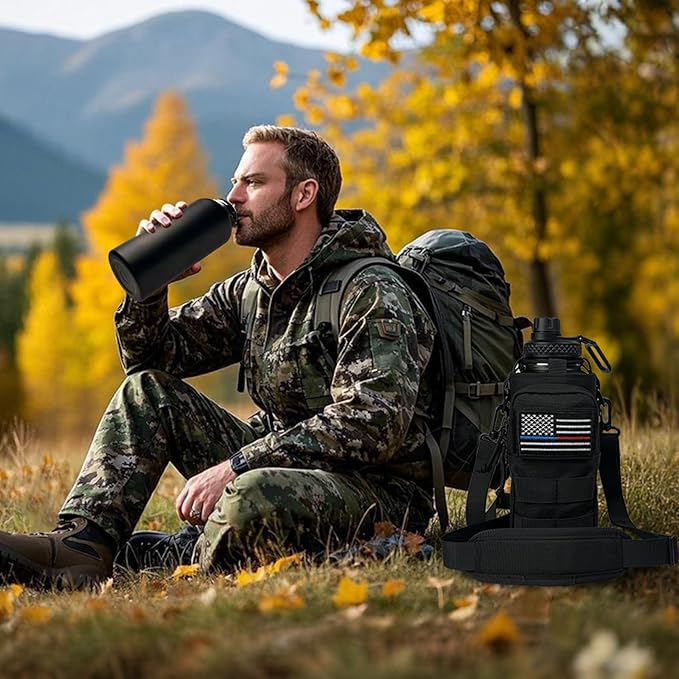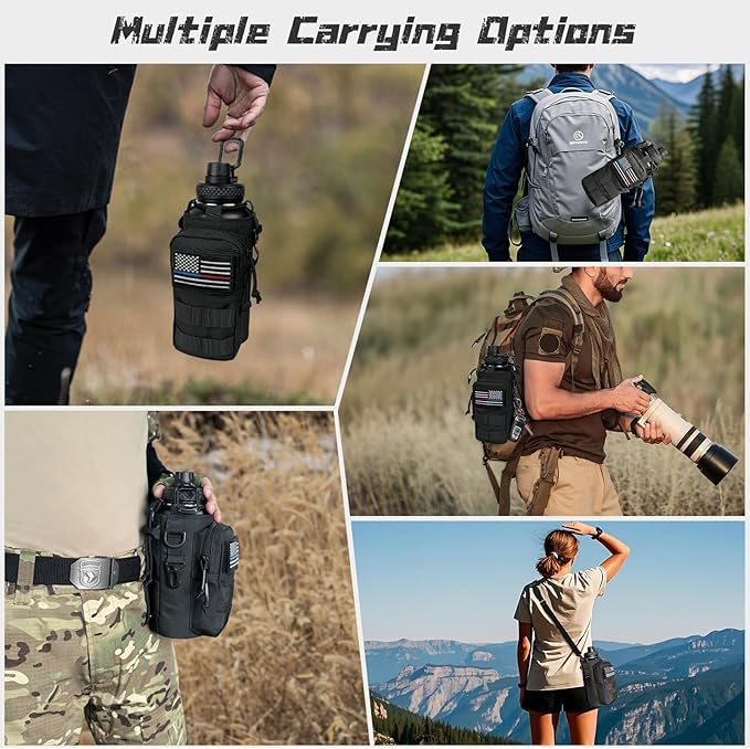 - MULTIPLE CARRYING OPTIONS: The water bottle holder features an adjustable strap, a metal clip, and MOLLE systems for versatile carrying. You can choose from crossbody carry mode, belt carry mode, backpack mount mode, or simply carry it by hand or attach it to your car. It is easy to add attachments and gear as needed and connect to other MOLLE equipment.