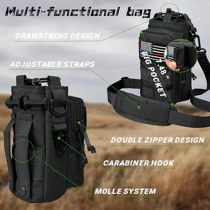 - MULTI-FUNCTIONAL WATER BOTTLE SLEEVE : This military water bottle bag is crafted from durable 1050D nylon, making it tear-resistant, easily removable and washable. It features a spacious front zippered pocket that can hold your Bluetooth earbuds, keys, phone, wallet, and other personal items. Additionally, the pocket has Velcro, allowing you to attach your own custom patch.