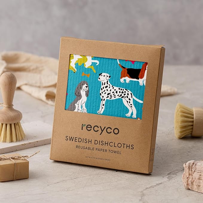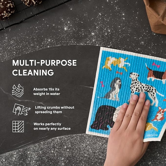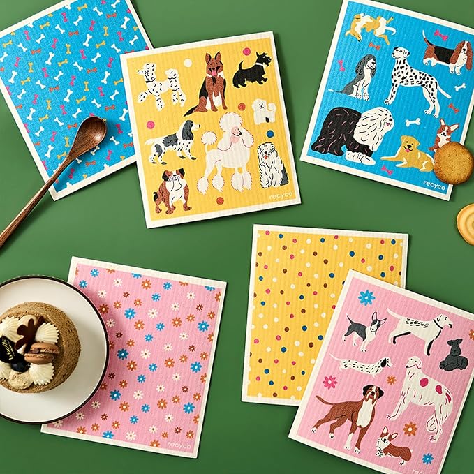 RECYCO Swedish Dishcloths for Kitchen | 6 Pack Doggy Daydreams Washable Dish Rags | Cellulose Reusable Cleaning Paper Towels | Absorbent Counter Dish Cloth Sponge Kitchen Wipes, 8" L x 7" W