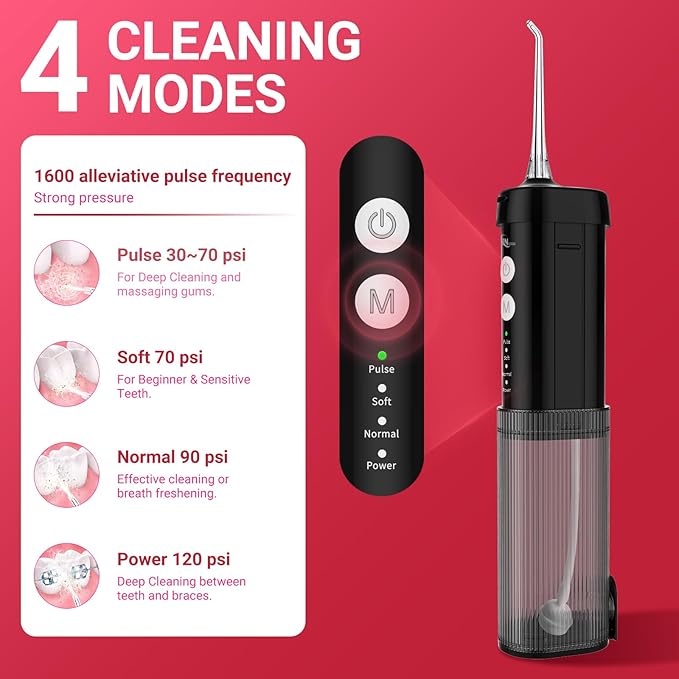 - 【4】 4 Clean Modes: JNGOODS cordless oral flossers teeth cleaner has Normal, Soft, Pulse and Power modes for choosing with Low-noise below 60db, which can meet various oral needs.