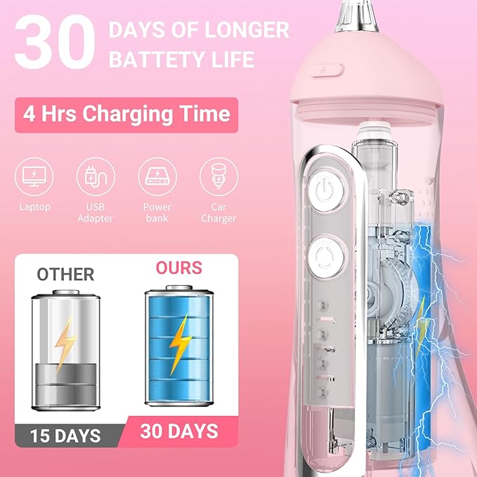 - 【1】Powerful Battery &T IPX7 Waterproof : JNGOODS Water flosser With 2000mah powerful battery, fully charged need 4 hours and used continuously for about 30 days. Come with Type-C cable,(Adapter Not Included), applicable to a variety of charging equipements such as power bank, computer, laptop... With double-sealing rings, oral irrigator prevent water leakage reliably, can use for shower in the bathroom and it's washable to clean.