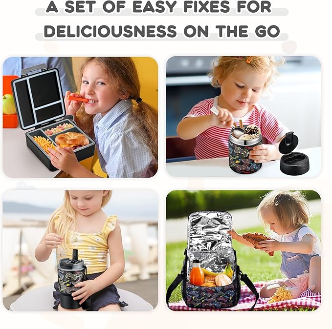 Lunch Box Set with Bento Box Container, 17OZ Stainless Steel Food Soup Thermo, Kids Water Bottle & Portable Insulated Lunch Bag – Leakproof, Hot/Cold Retention for School, Travel (Black-Game)