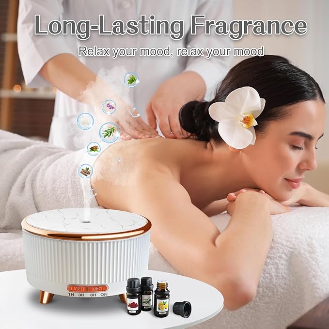 - 【Ultrasonic diffuser &1/3/6H Timing】:Essential oil diffuser aromatherapy for large room aroma 360 scent machine for home use ultrasonic technology,cool essential oil diffuser has delicate spray,relieves dry skin,home luxury scents diffuser has 3 timer settings(1/3/6H Timing).You can set the time according to your needs.Essential oil humidifier helps to you sleep better,home scent humidifier and diffuser for office allow you to breathe comfortably.Let the family enjoy the tranquility.