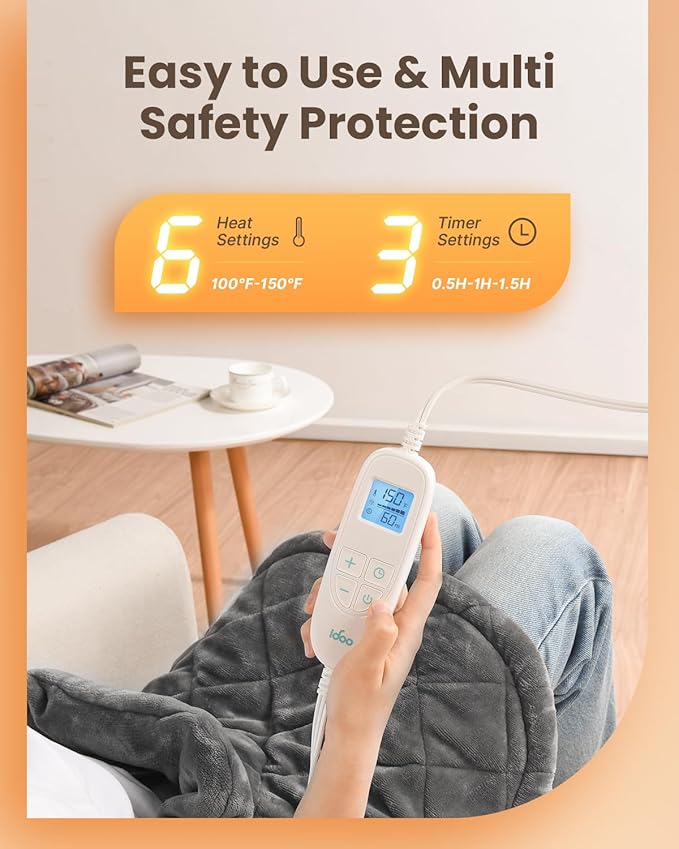 - 6 Heat Settings & 3 Auto-Off Timers: Features 6 adjustable heat levels (100℉-150℉), reaching up to 10℉ higher than others brand to satisfy both everyday use and those needing higher temperatures. Includes 3 auto-shutoff timers (0.5H, 1H, 1.5H) for energy conservation and to prevent overheating, ensuring safety.