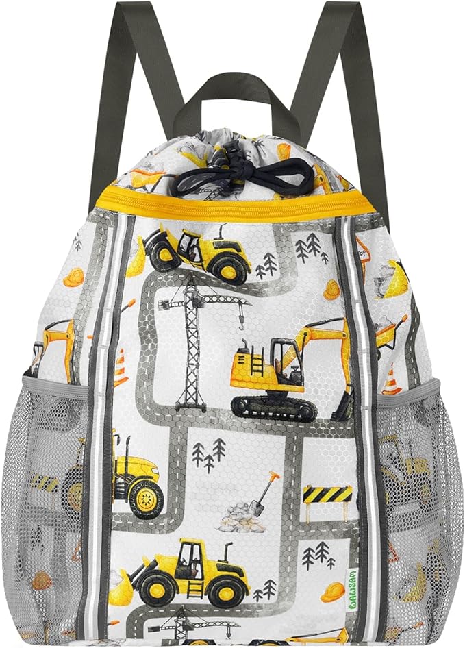 WAWSAM Kids Gym Drawstring Backpack String Bag, Truck Sports Gym Bag for Kids Boys Waterproof Swimming Beach String Cinch Backpack with Two Water Bottle Pocket