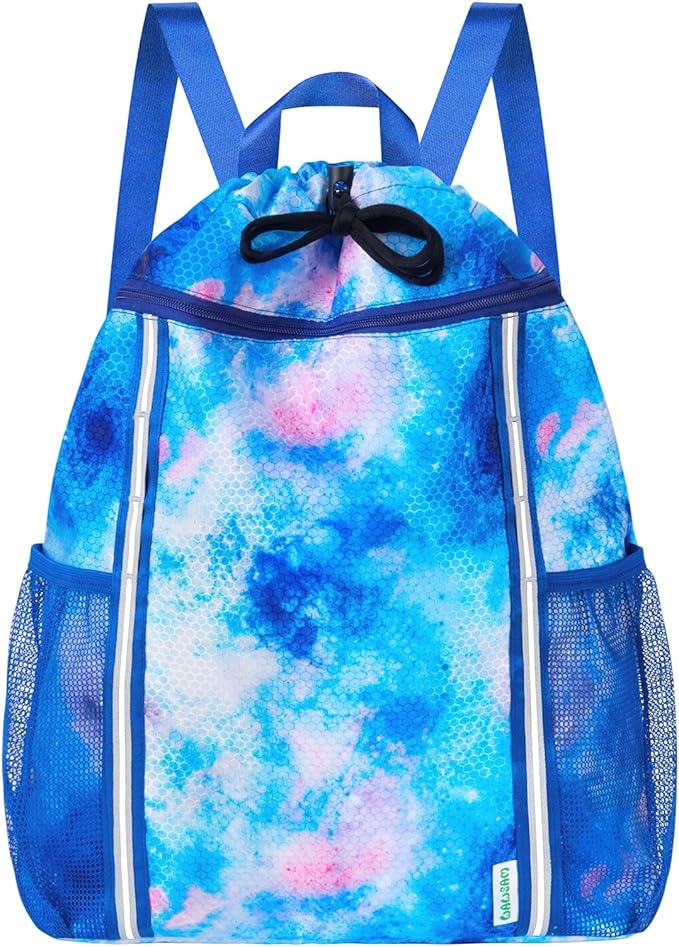 WAWSAM Kids Gym Drawstring Backpack String Bag, Tie Dyed Sports Gym Bag for Kids Girls Waterproof Swimming Beach String Cinch Backpack with Two Water Bottle Pocket