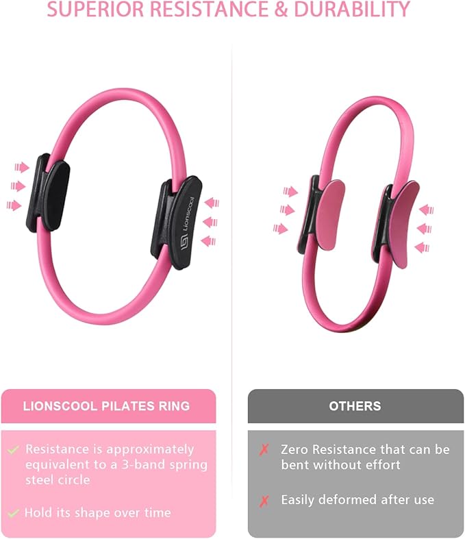 - Resistance: Nobody wants to deal with a Pilates ring that has zero resistance. The LIONSCOOL Pilates Ring is about the same resistance as the 3-band circle made of spring steel. Our ring is appropriate for most users and for those who want to take things up a notch. But this resistance level is a little difficult for those who are just beginning a conditioning program after a long period of inactivity. So, listen to your body and feel the magic in every movement with LIONSCOOL Pilates Ring