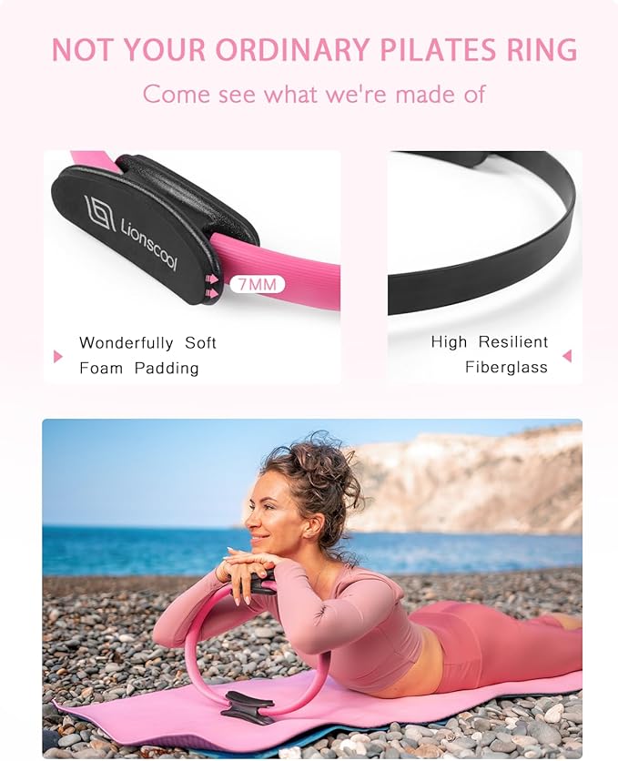 - Built to last: You don’t need all of that bulky equipment to get started if you are new to Pilates. This 14-inch LIONSCOOL Pilates Ring is where the magic happens. It boasts high grade, resilient fiberglass encased in a thick rubber shell, which gives the ring a superior resistance and durability. It also features an unrivalled comfortableness thanks to the wonderfully soft, 7mm thickness foam padding on both inner and outer handles. Take your Pilates anywhere, anytime with this Magic Circle