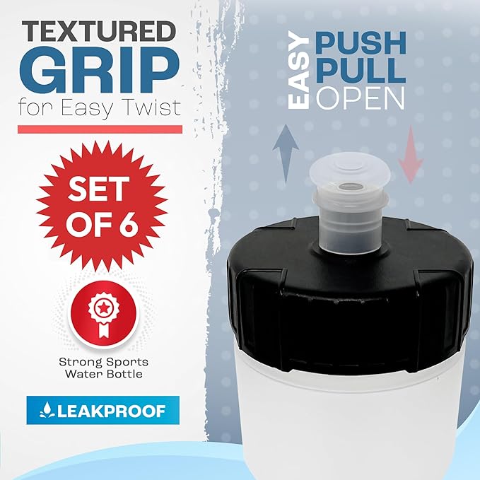 - Durable & BPA-Free: 22 oz reusable sports water bottles made of easy-squeeze polyethylene; top rack dishwasher safe for easy cleaning. Includes six bottles in assorted colors. Fits most bike cages. Suitable for ages 3+.