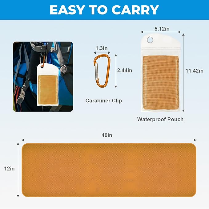 - Convenient and Portable: The sweat towels are lightweight and compact, and the large, thin towels roll into a foldable travel size that can easily fit into your bag or pocket for cooling wherever you need to cool down. Perfect for those traveling light. Comes with a waterproof bag and carabiner clip, making it easy to attach to water bottles, backpacks, camping gear, hiking tools, and more.