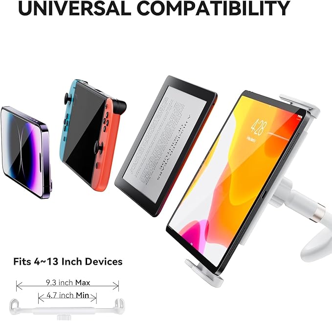 - 【APPLICABLE FOR MOBILE PHONE AND TABLET】 - Fit for ipad iphone Series/Nintendo Switch/ Galaxy Tabs/Amazon Kindle Fire HD, this ergonomic gooseneck tablet holder, compatible with all 4.7 - 11 inch cell Phones and tablets
