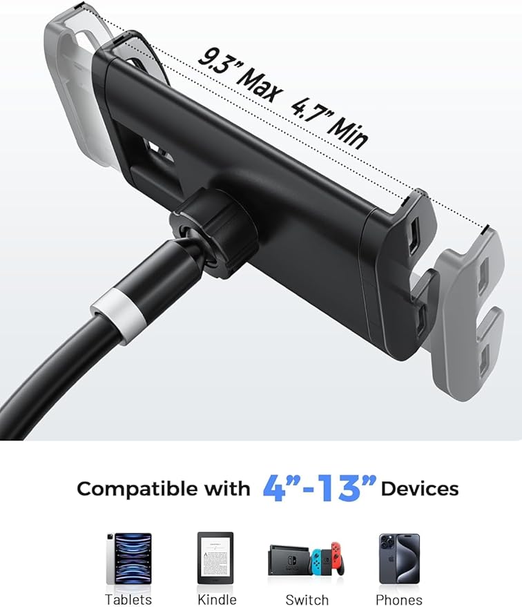 - 【APPLICABLE FOR MOBILE PHONE AND TABLET】 - Fit for ipad iphone Series/Nintendo Switch/ Galaxy Tabs/Amazon Kindle Fire HD, this ergonomic gooseneck tablet holder, compatible with all 4.7 - 11 inch cell Phones and tablets