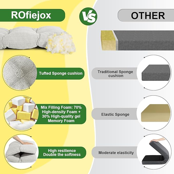 - A Smart Mixed Filling Discover the Pinnacle of Comfort:ROFIEJOX bench cushion’s filling blends 80% high-density foam (firm support that won’t sag) + 20% memory foam (body-cradling softness) for Perfect balance - soft and comfortable but with good support