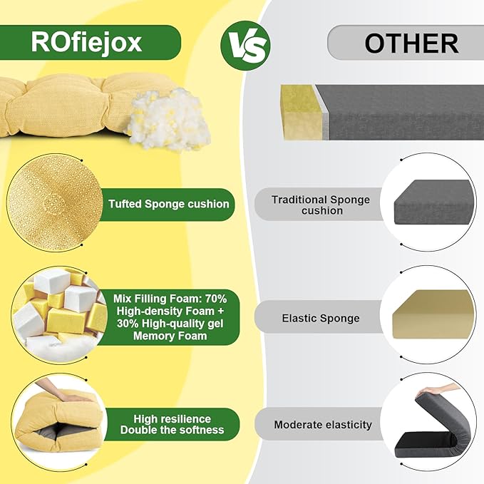 - A Smart Mixed Filling Discover the Pinnacle of Comfort:ROFIEJOX bench cushion’s filling blends 80% high-density foam (firm support that won’t sag) + 20% memory foam (body-cradling softness) for Perfect balance - soft and comfortable but with good support