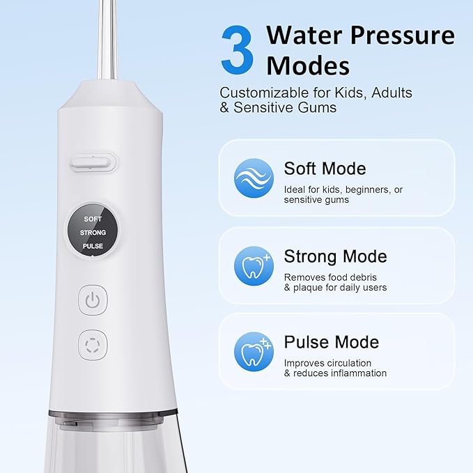 - 3 Cleaning Modes & Adjustable Pressure Settings: Equipped with 3 smart modes—Soft, Strong, and Pulse—this electric flosser meets a wide range of oral needs. With water pressure adjustable from 60 to 120 PSI and pulse frequency up to 1800 times/min, it’s great for both beginners and experienced users. The built-in memory function automatically recalls your last-used mode. Perfect as a water flossers for teeth solution in your daily teeth cleaning kit.