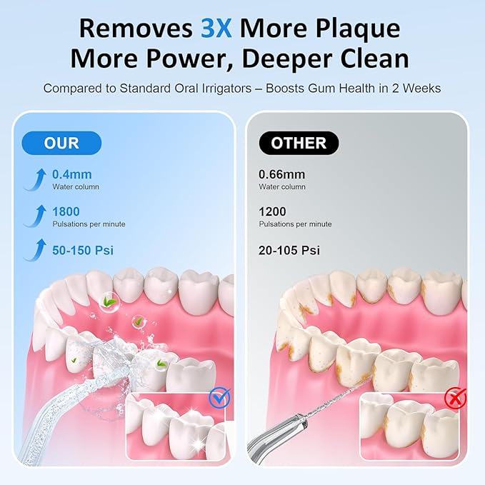 - Dentist-Inspired Water Flosser: All precision Jet Tips feature a 0.4mm ultra-fine spout—thinner and more precise than standard 0.6mm tips—for better access between tight teeth or around braces and dental work. It’s 3x more effective than traditional dental floss, removing up to 99.9% of stains and food particles. Ideal dental flosser for adults, kids, and users with braces, implants, or crowns.