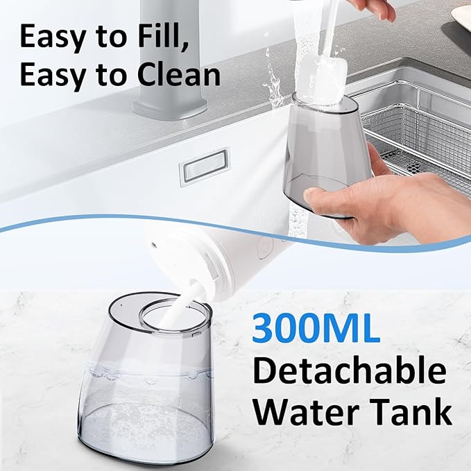 - Designed for convenience, the large 300ml BPA-free water tank: supports full-mouth cleaning without frequent refills. The detachable tank makes it easy to clean and refill. Certified IPX7 waterproof, you can safely use it while showering. The lightweight body features an ergonomic, anti-slip back design that fits naturally into your palm—providing a secure, comfortable grip even with wet hands. Quiet (<55dB) and portable, it’s ideal for home use, travel, or daily oral care on the go.