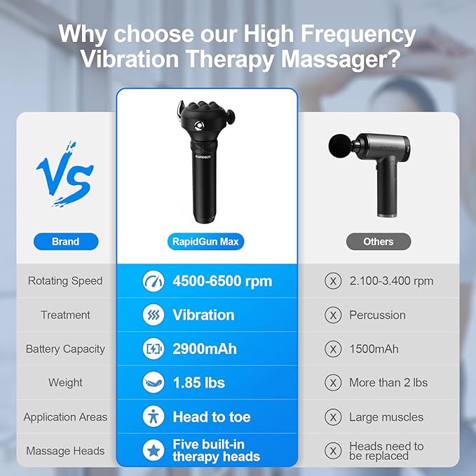 - Quiet Deep Tissue Massage: The RapidGun Max operates with minimal noise,making it perfect for use at the office to relieve shoulder fatigue or for post-workout recovery. The handheld fascia massage gun balances power and quietness, so you no longer have to choose between soothing and peace