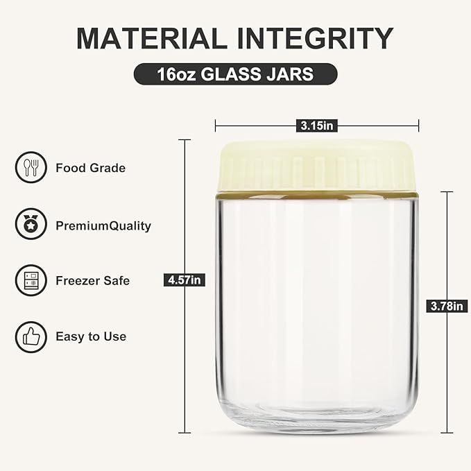 - [Perfect Sealing and Easy Cleaning] Yogurt containers silicone gasket inside the lid has excellent sealing and leak proof properties, Overnight oats containers with lid is ideal for yogurt, oatmeal, fruits salad. Wide mouth mason jar with lid can keep food fresh and prevent spillage when carried. Glass storage jars with airtight lids making it easy to put and take out food, as well as clean. Glass containers with lids offer a hassle-free experience with meal preparation.