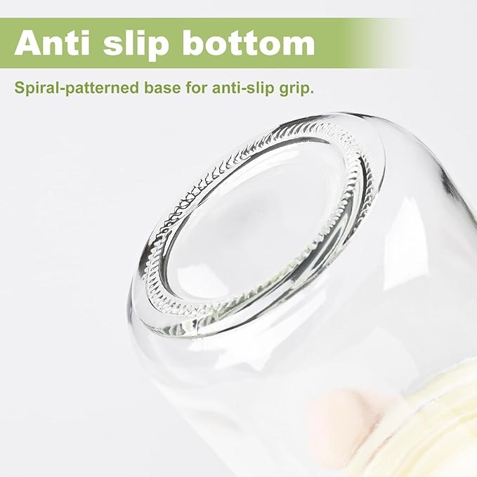- [Premium Quality and Safety Assurance] These glass jars with lids are made of high-quality glass, BPA free and lead free. The meal prep jars with lids requiring manual installation of matching silicone sealing rings. The circular concave design at the bottom of the overnight oats jar increases friction to achieve anti slip effect, greatly enhancing the safety performance of the yogurt jars. 10 oz glass containers with lids are safe for refrigerator and dishwasher.