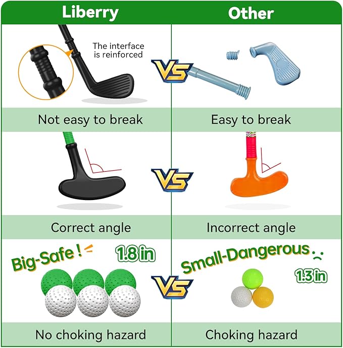 - LITTLE GOLFERS' GIFT: Liberry toy golf set includes 1 golf cart, 3 toddler golf clubs (putter, wood, iron), 6 golf balls (3 green, 3 white), 2 golf tees, 2 holes. The fully equipped kids golf set is an ideal birthday holiday gift for your little golfer. Recommended Height: Under 3'5" (105 cm)