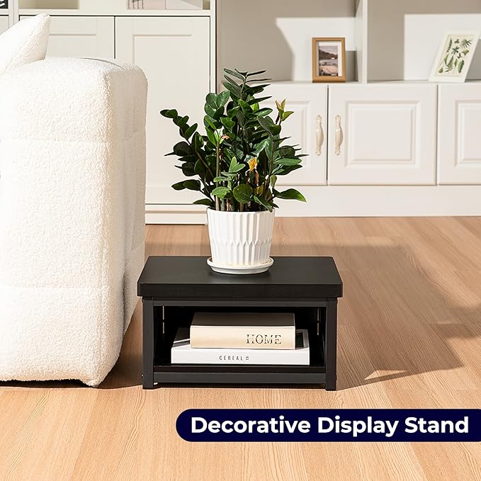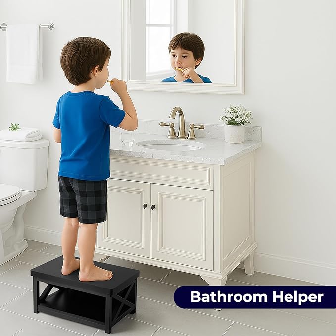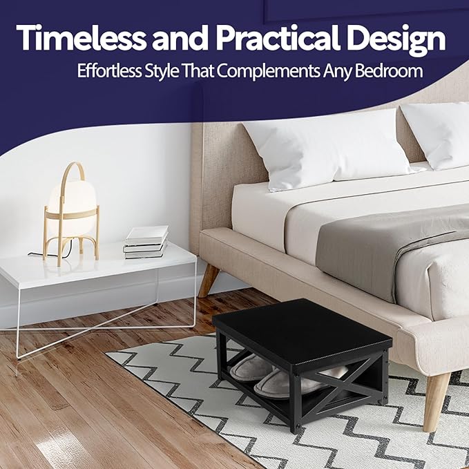- Elegant Decorative Design – Finished in a sleek black with X-frame side details, this decorative step stool blends with modern, rustic, or farmhouse interiors. Use it as a stylish wooden stepping stool or compact display stand.