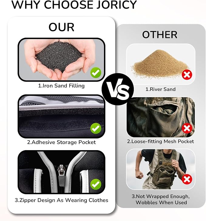 - The JORICY weighted vest is adjustable in weights and tightness allows for a comfortable and secure fit during routine workouts. The addition of the ironsand weights provides a challenging resistance that has taken your cardio and strength training to the next level.