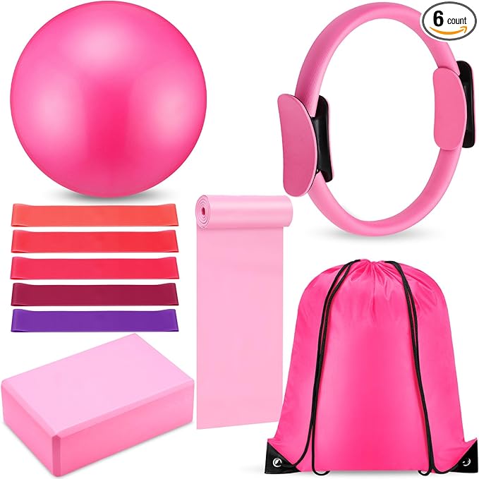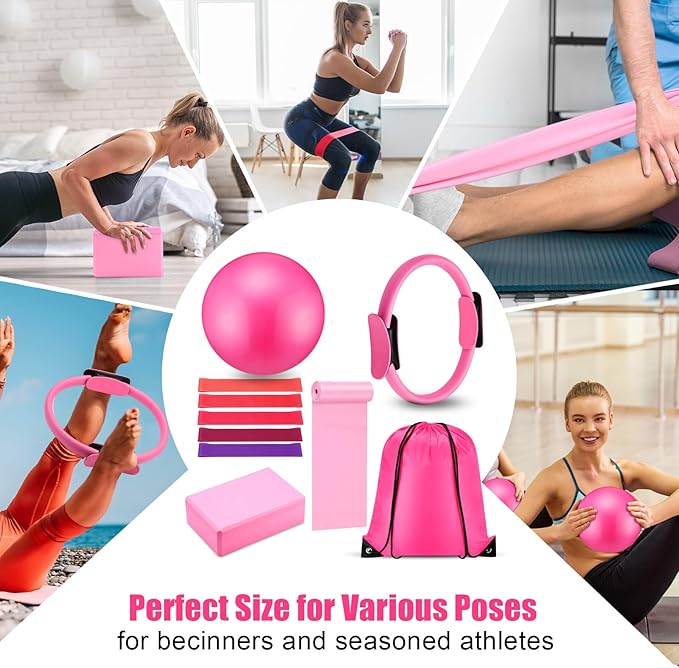 - Comprehensive Pilates Package: this quality pilates equipment set grants you access to a broad spectrum of exercises; It includes 1 pilates ring, 1 pilates ball, 1 yoga brick, 5 yoga straps, 1 elastic band, and 1 fitness bag; This set's nature improves flexibility, agility, and strength in muscles, legs, core, and arms