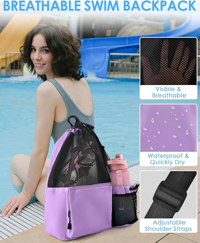 • Durability: Mesh swim backpack is crafted with sturdy fabric and reinforced stitching, which can withstand daily wear and tear. Especially, these swim bags are also machine washable. Ideal for swimming, biking, camping, hiking, pool, beach, gym, sports, etc