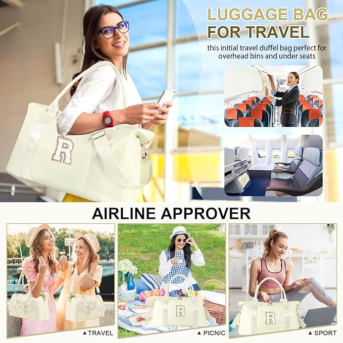 Dance Gym Duffel Bag for Teen Girls, Personalized Initial Travel Weekender Bag,Cute Overnight Carry On Duffle for Women,Sports Travel Cheer Bag,Monogram Christmas Gifts for Tween Preppy(beige-R)