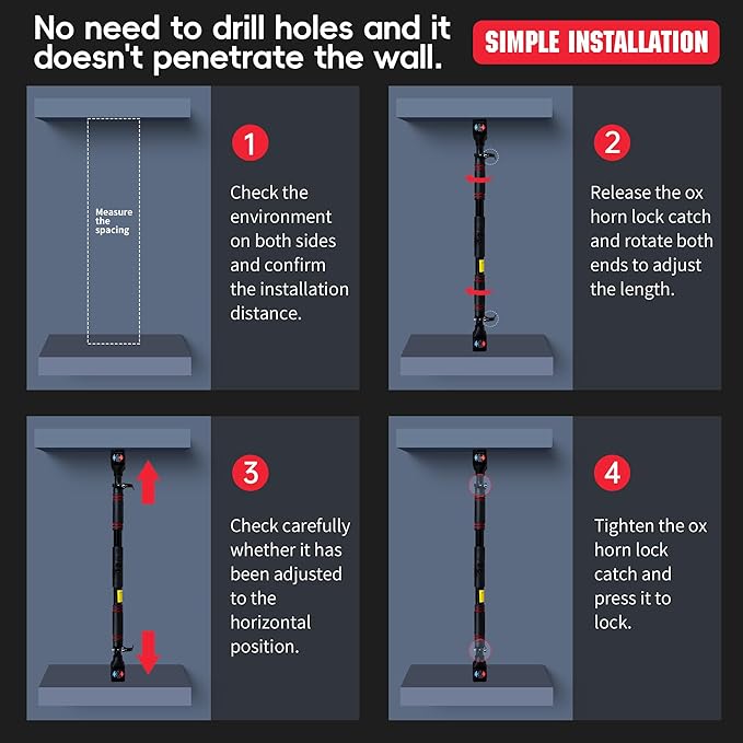 - 【Adjustable Pull Up Bar】The pull-up bar can fit in most door frame between 27.5"- 39". Note: Verify the marked rotation direction; reversing it may cause locking