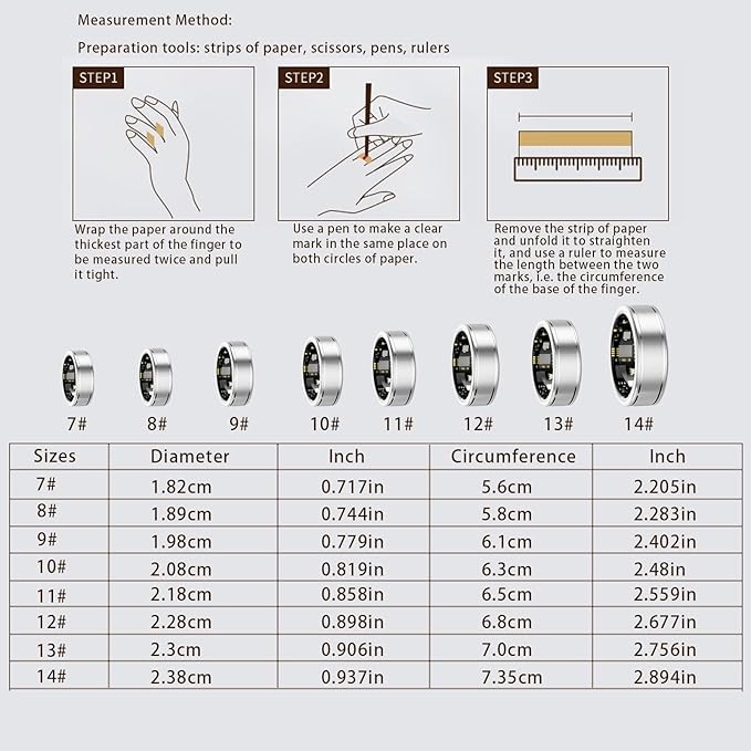 - 【Select the Right Size】: Measure your finger circumference using our size guide to ensure the best fit. The Anarow smart health ring is available in eight sizes (non-adjustable). If between sizes, choose the larger one for comfort and more stable sensor contact