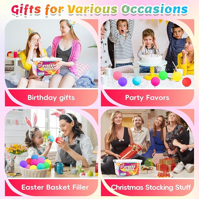 - 🔴【120 Pack Stress Balls Set】 This soft stress balls set includes 12 different colors of stress ball, 10 of each color, placed in a beautiful gift box. The stress ball for kids and adults is cute and soft. Our squishy ball that measures 1.6 inches and fits perfectly in the palm of the hands. These squishy stress balls are very interesting, can be squeezed arbitrarily to relieve stress and create entertainment, suitable for kids 3+ ages.