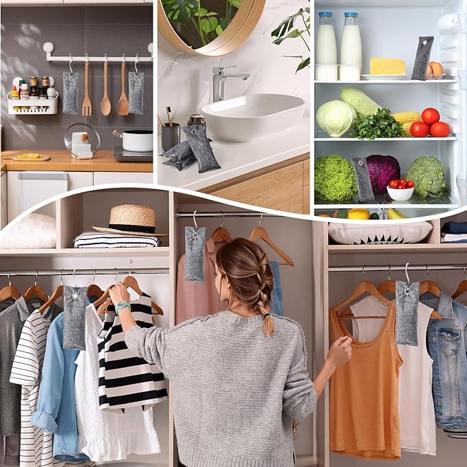 - 【Activated Charcoal】:This set includes 8 charcoal deodorizer bags (50g each) with hooks, designed to naturally absorb odors and moisture for a fresher environment.
